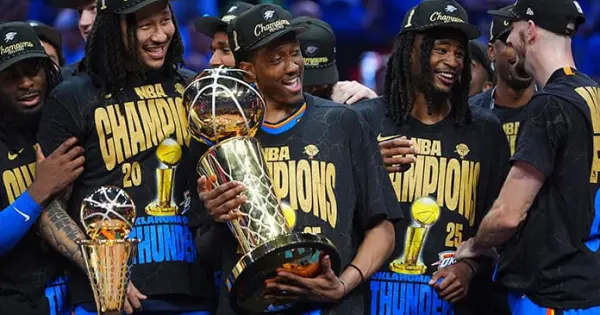 Jalen Williams anotó 20 y Chet Holmgren apoertó 18 para el Thunder, que fue llevado al límite en un séptimo y devisivo juego en las Finales de la NBA, pero culminó una temporada para la historia. Oklahoma City ganó 84 juegos entre la temporada regular y los playoffs, empatando con los Bulls de Chicago de 1996-97 por el tercer lugar en cualquier temporada.