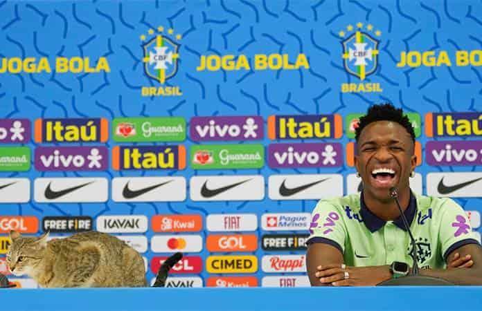 Un gato interrumpe la rueda de prensa de Vinicius (VIDEO)
