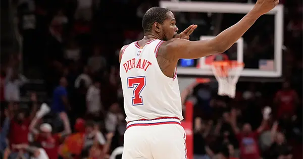 HOUSTON.- Kevin Durant anotó 29 puntos y los Rockets de Houston ampliaron su seguidilla de triunfos a ocho, al doblegar el jueves 113-102 a unos 76ers de Filadelfia carentes de Joel Embiid, sometido en la jornada a apendicectomía.