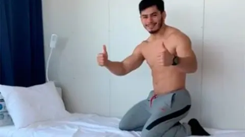 Luego de caer sobre la cama de la Villa Olímpica y comprobar su resistencia, el atleta mostró sus pulgares como señal de aprobación de que la cama logró resistir ese salto.