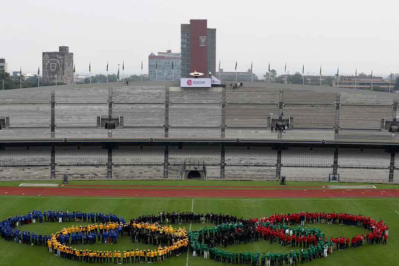 El estadio Olímpico Universitario fue el escenario por el que desfilaron figuras que dejaron huella en los Juegos Olímpicos México 68, quienes conformaron los aros representativos en el césped.