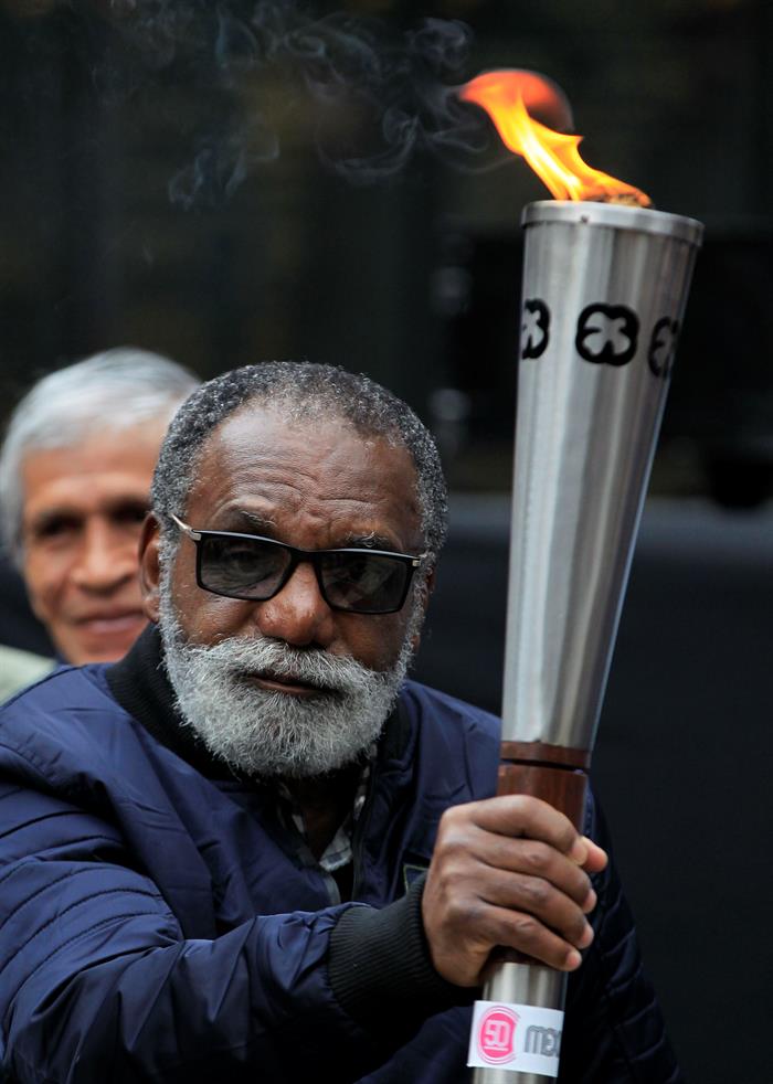 Basilio, de 70 años de edad, ya no subió los más de 90 escalones como lo hizo hace 50 años, no vistió toda de blanco, pero la emoción fue la misma al encender el pebetero del Estadio Olímpico no sin antes saludar a los cuatro puntos cardinales con la flama en todo lo alto.