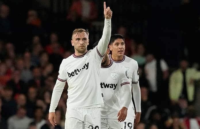Bowen puso en ventaja al West Ham en el minuto 37, encontrándose con un cruce perfectamente enviado por el brasileño Lucas Paquetá, para definir de cabeza rebotando el balón hacia el portero Thomas Kaminski.