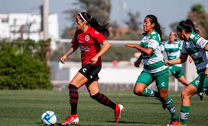 Tijuana fue mejor en el inicio en la cancha alterna 1 del estadio de Tijuana y llegó con peligro a la portería rival, pero sin éxito; Santos se encontró con un penalti que le dio ventaja al minuto 29, obra de Alexxandra Ramírez, y al 36 amplió la ventaja Guadalupe Ojeda.