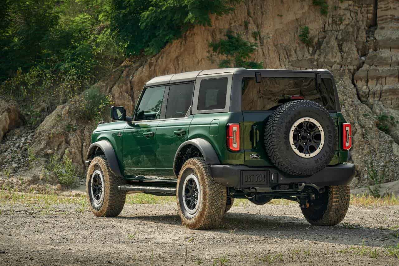 La capa transparente teñida antimateria azul, azul relámpago metálico y rojo rápido metálico teñida estará disponible como opciones de color exterior hasta finales del año modelo 2021. Los pedidos de Bronco 2022 de dos y cuatro puertas, incluidos Eruption Green y Hot Pepper Red, se abrirán a finales de este año.