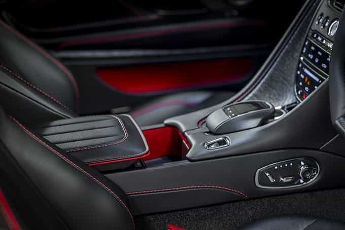 En el interior, el DBS Superleggera está recortado en cuero negro puro, acentuado por Alcantra de mezcla gris, como en el DBS original de 1969. La carlinga está acentuada en rojo, inspirada en la guantera con adornos rojos en el auto original, que sostenía el rifle telescópico de 007.