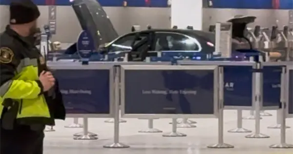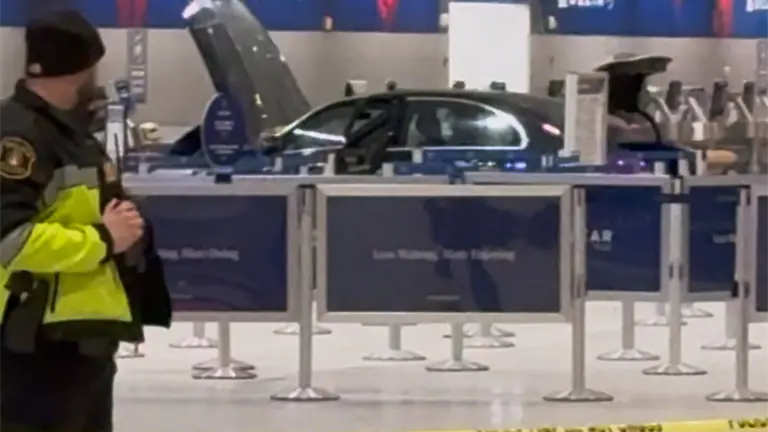 Un video publicado en redes sociales mostraba un sedán azul de cuatro puertas parado, con el capó y el maletero abiertos, frente a los mostradores de Delta Air Lines en lo que parecía ser un vestíbulo de salidas.