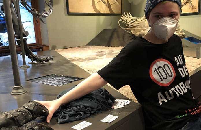 Las dos activistas se pegaron al pedestal sobre el que se exhiben varios esqueletos de dinosaurios y también a la garra de un Iguanodonte.
