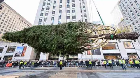 Las multitudes eran mucho más grandes en el número 30 de la Plaza Rockefeller, donde los trabajadores utilizaron grúas para colocar el árbol, de 11 toneladas, en su posición, con vista a la icónica pista de patinaje. La gente se reunió con tazas de café y mientras los equipos sujetaban el abeto y comenzaban el cuidadoso proceso de estabilizarlo.