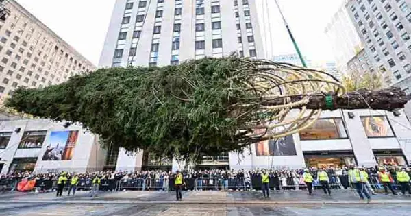 Nueva York.- El árbol de Navidad del Centro Rockefeller fue izado el sábado en su nuevo hogar en Manhattan, marcando el inicio de la temporada navideña en la ciudad de Nueva York.