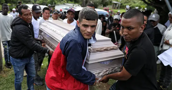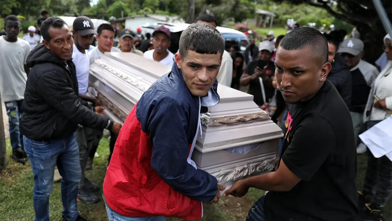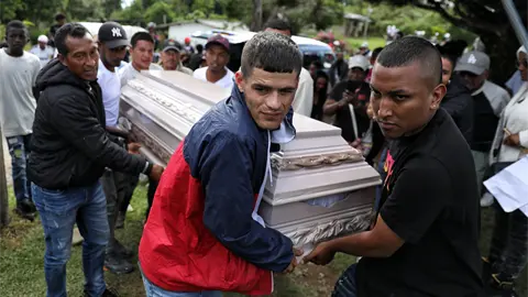 Familiares y amigos de Daniela Valencia, de 26 años, cargaron su ataúd en medio del llanto en Cajibío, poblado donde ocurrió el ataque y de donde eran oriundas 12 de las víctimas. Se espera que el martes se realice un entierro colectivo, luego de que el instituto forense culminara la identificación de las víctimas.