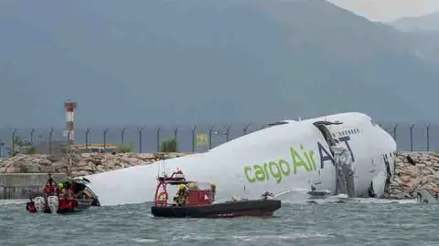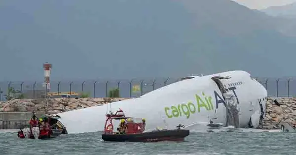 Hong Kong.- Un avión de carga salió de la pista en Hong Kong y cayó al mar al aterrizar, causando la muerte de dos personas, informaron las autoridades.
