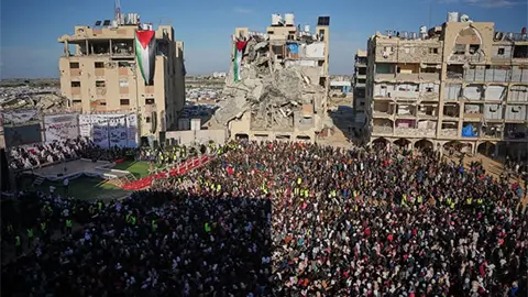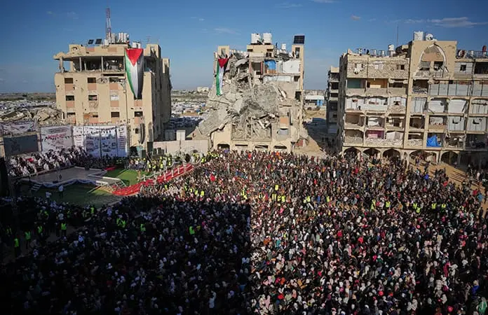 Mientras una multitud entusiasta ondeaba banderas palestinas en la ciudad sureña de Jan Yunis, las celebraciones se vieron atenuadas por la crisis continua en toda Gaza. La mayoría de los dos millones de residentes de Gaza, incluidos Eman y Hikmat Lawwa, han sido desplazados por la guerra, áreas enteras de ciudades han sido arrasadas y la escasez de ayuda y los estallidos de violencia continúan afectando a la vida diaria de las personas.