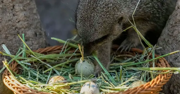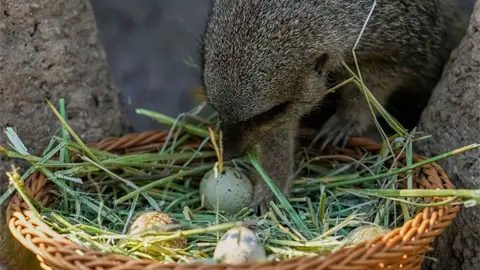 Una suricata tenía una canasta con huevos colocada entre unas rocas en su recinto. A los monos y lémures se les dieron frutas escondidas en bolsas de papel marrón decoradas con orejas de conejo.