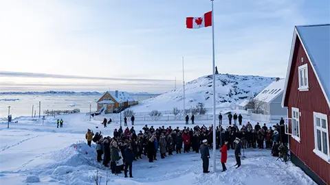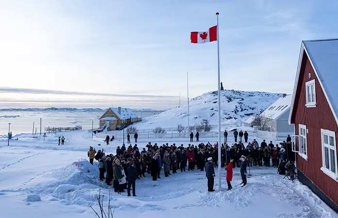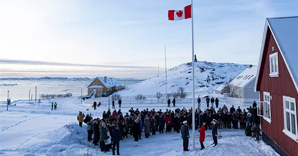 La bandera de Canadá se izó y decenas de personas cantaron "O Canada" mientras la ministra de Relaciones Exteriores, Anita Anand, inauguraba oficialmente el consulado canadiense en Nuuk, que también es la ciudad más grande de la helada isla ártica.