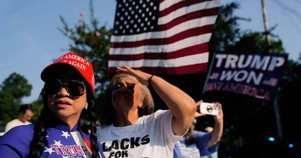 Por la zona se pasean seguidores del republicano con ropa con los colores de la bandera estadounidense, banderas con el rostro de Trump e incluso un grupo de afroamericanos que se autodenomina "Negros con Trump".