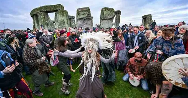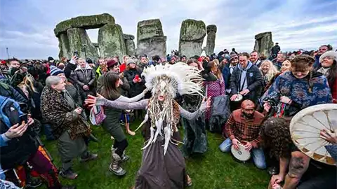 Poco antes de las 08:00 GMT el cielo empezó a despejarse, hasta que el sol hizo su entrada oficial nueve minutos más tarde, ante los vítores de la multitud -unos 8.500, según la BBC- que celebró la llegada del invierno con atuendos paganos y al son de cánticos y bailes ancestrales.