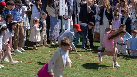 Casi siglo y medio después, la escena apenas ha cambiado: los niños siguen compitiendo por empujar huevos de colores con cucharas de madera, entre risas y gritos de aliento. En este caso, la primera dama también participó en algunos de los juegos con los pequeños.