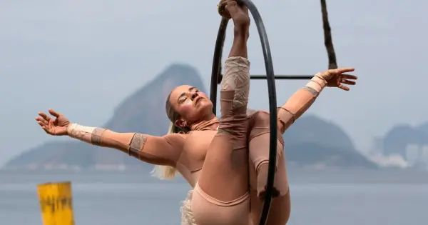 NITEROI, Brasil (AP) — Artistas se retorcieron y giraron sobre la arena en una playa al otro lado de la bahía de Río de Janeiro en un espectáculo de circo aéreo que buscó llamar la atención sobre el problema generalizado de la violencia contra las mujeres en Brasil.