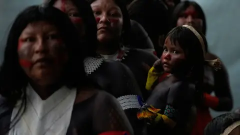 Un grupo indígena asistió a la ceremonia inaugural de la Cumbre de los Pueblos, celebrada al margen de la conferencia climática COP30, mientras otras personas paseaban a orillas de un río al atardecer en Belém, Brasil.