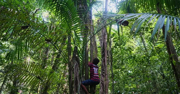 Así es como se ha cosechado la baya de açaí durante generaciones en los quilombos brasileños, comunidades de descendientes de esclavos fugitivos. La técnica mínimamente invasiva no daña los árboles y ayuda a mantener en pie los bosques amazónicos.