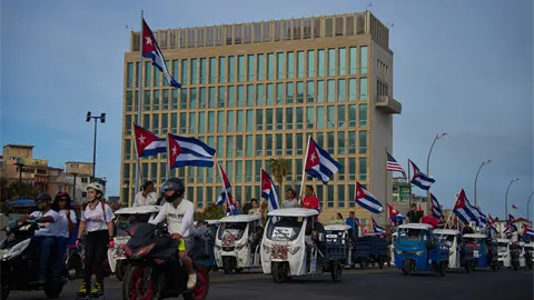 LA HABANA (AP) — Cientos de cubanos realizaron el jueves una caravana en motos, triciclos y bicicletas que pasó frente a la embajada de Estados Unidos en La Habana en protesta por las sanciones de Washington a la isla.