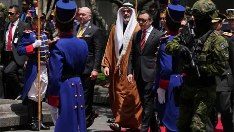 El sábado el gobierno ecuatoriano se solidarizó con Emiratos Árabes Unidos y condenó lo que calificó de "injustificables ataques" iraníes a su territorio. En un comunicado, la cancillería le agradeció al príncipe heredero el no haber suspendido su visita, aunque ésta se redujo a menos de tres horas.