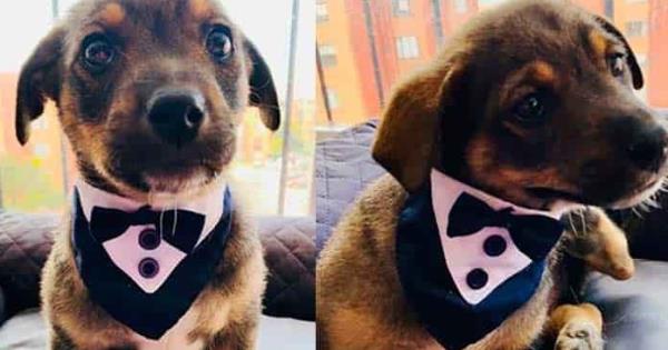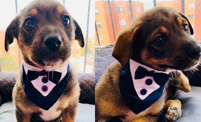 La fundación colombiana compartió dos fotografías de “Vicente”, en las que se observa al perro con un pañuelo que simuló un smoking con un moño azul.