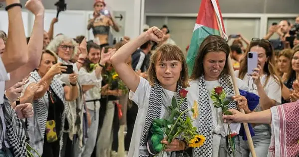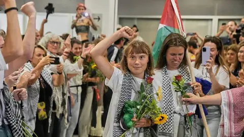 La activista sueca fue una de las docenas de deportados que aterrizaron en Atenas el lunes por la tarde. Multitudes de simpatizantes se reunieron en el Aeropuerto Internacional Eleftherios Venizelos y corearon “¡Liberen, liberen a Palestina!” Mientras los activistas desembarcaban.