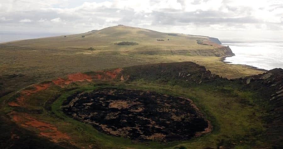 El humedal en la que está el moai, que se secó en los últimos años, fue una zona que sufrió un incendio hace unos meses y que afectó a varios moais cercanos, situados en las colinas interiores del volcán Rano Raraku.