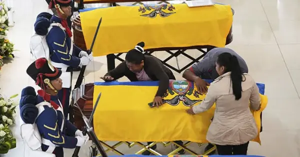 Los féretros de los uniformados formaban una extensa hilera en una de las salas de la Escuela Superior Militar Eloy Alfaro ubicada en el norte de Quito, la capital, a donde llegaron la noche previa para ser velados en una capilla ardiente. Tras la ceremonia religiosa los féretros serían trasladados a las provincias de donde procedían los soldados fallecidos.