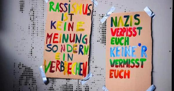 Carteles con consignas antirracistas en un improvisado monumento por los ataques en Hanau, Alemania / Foto: EFE