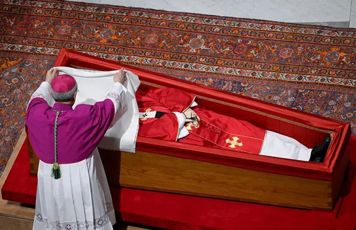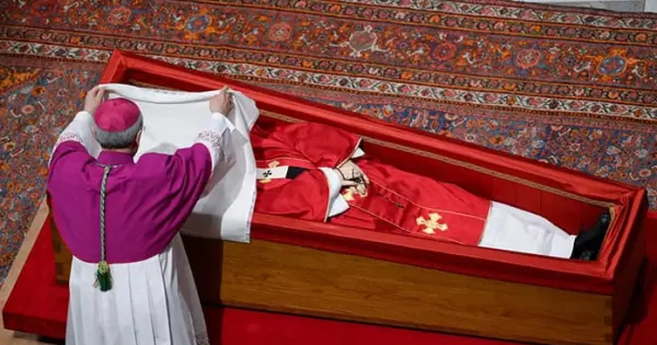 Un cambio de guardia a los lados del ataúd abierto de Francisco indicó el final del periodo de velatorio. El difunto papa estaba vestido con túnicas rojas, una mitra de obispo y un rosario entrelazado en sus manos. Será enterrado con sus zapatos negros desgastados, emblemáticos de la vida sencilla que defendía.