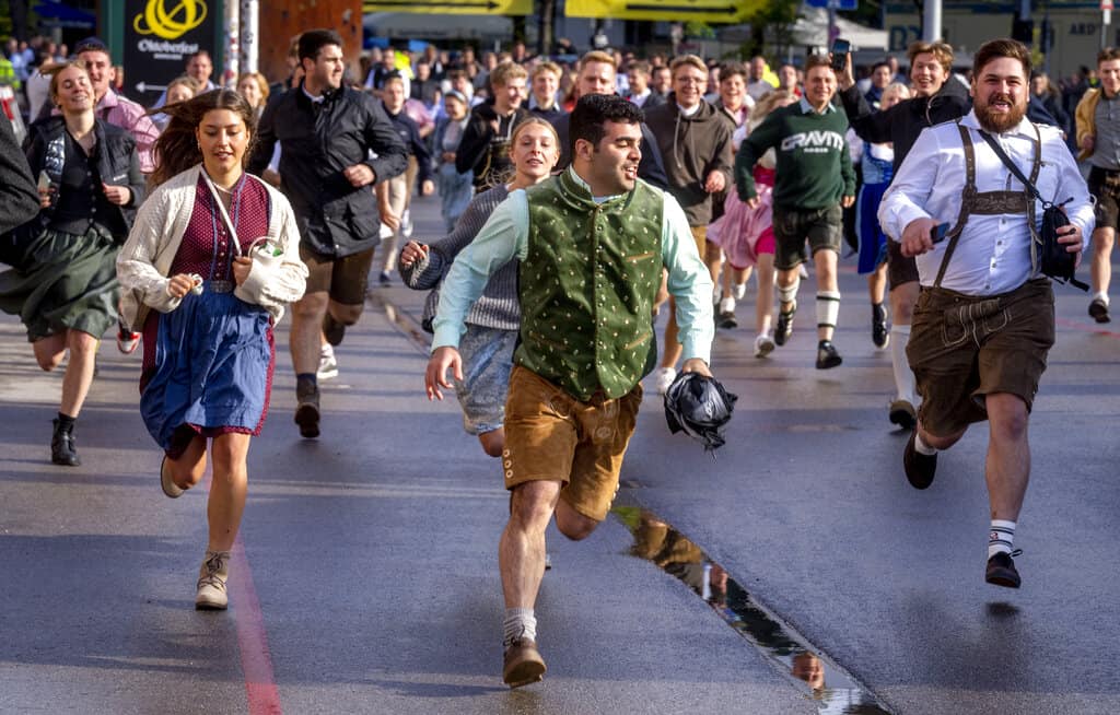 A la apertura de los accesos siguieron las primeras carreras hasta las carpas, principalmente por parte de jóvenes con los tradicionales "Dirndl" -las mujeres- o pantalones de cuero -los hombres-, en muchos casos asomando por debajo del abrigo o impermeable.