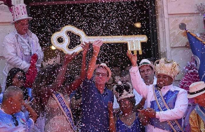 “Aquí entrego las llaves a quien va a dirigir Río de Janeiro hasta el Miércoles de Ceniza: no me busquen, busquen al Rey Momo, para que decrete abierta la mayor de todas las celebraciones, el Carnaval carioca”, dijo el alcalde durante el acto.