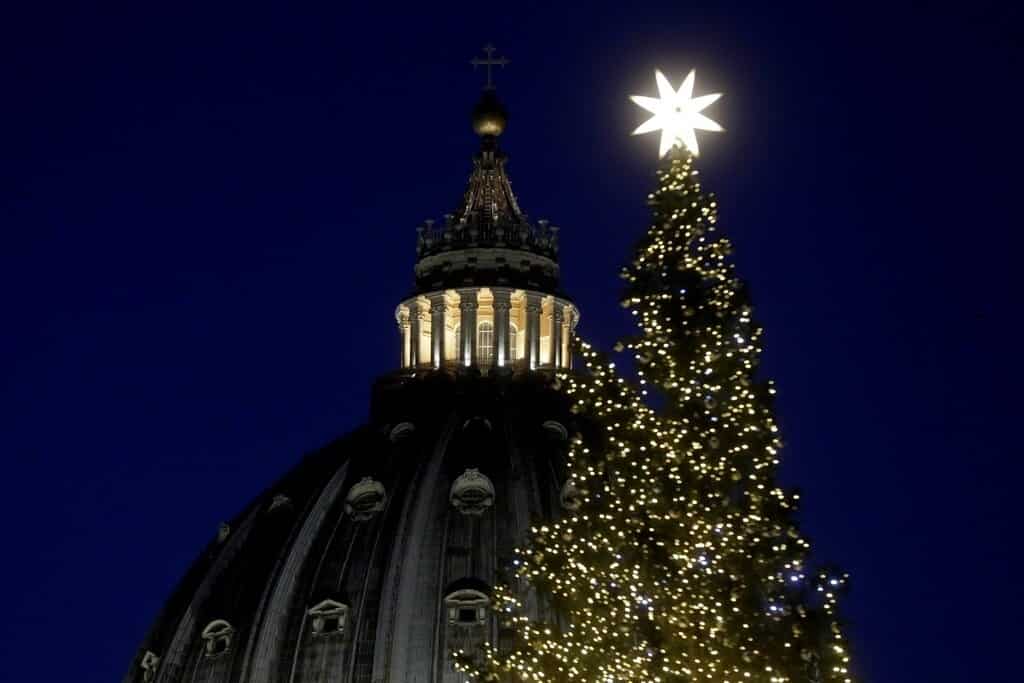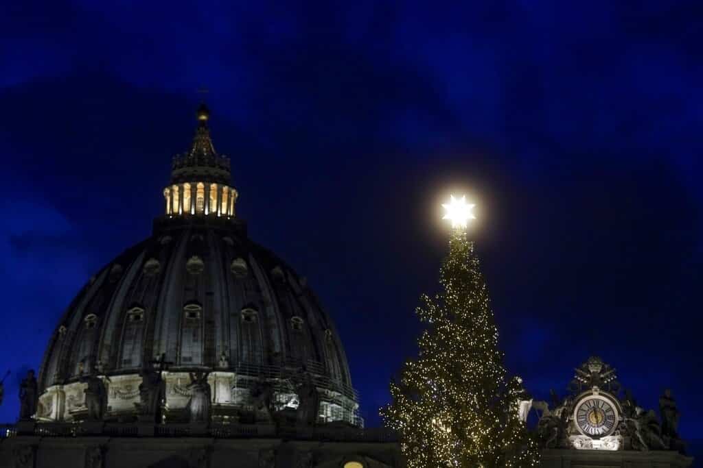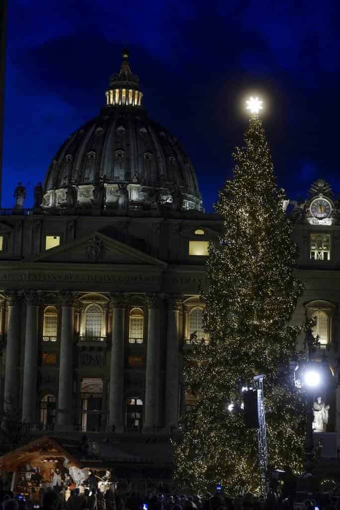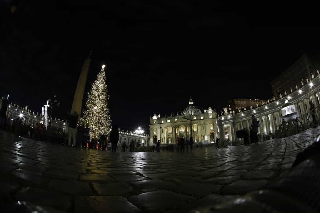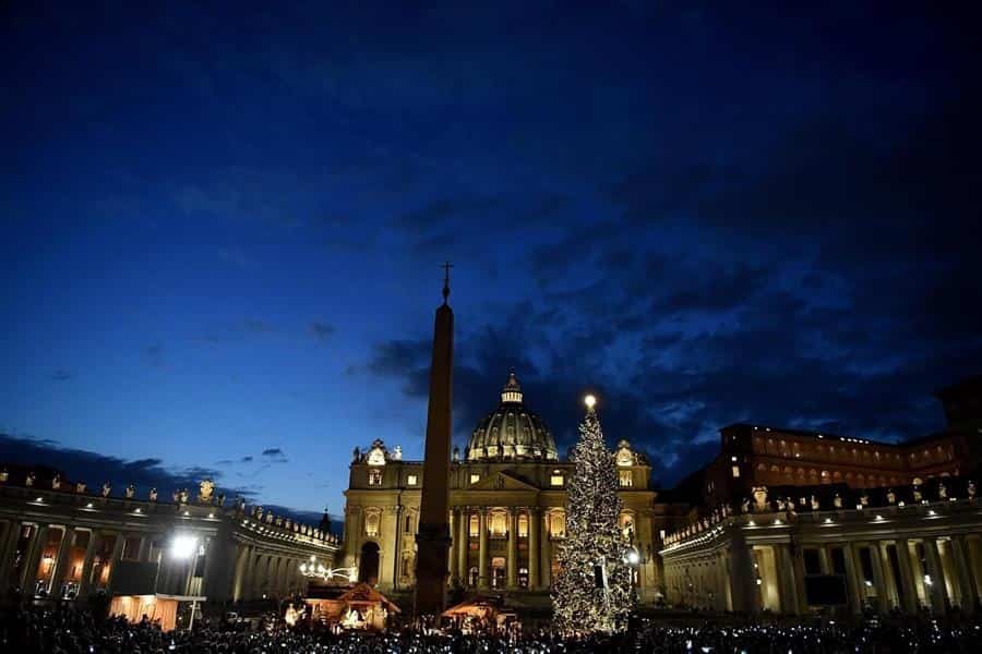 CIUDAD DEL VATICANO (EFE).- La plaza de San Pedro del Vaticano se ha teñido desde hoy de ambiente navideño con la inauguración de su monumental Portal de Belén y con el encendido de su árbol de Navidad ante cientos de romanos y turistas.