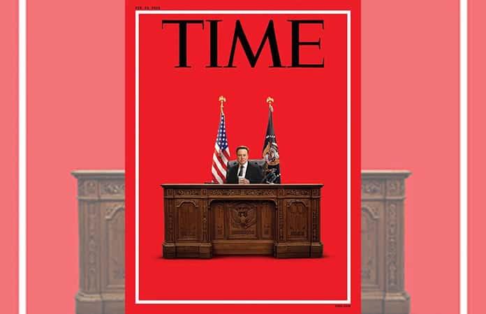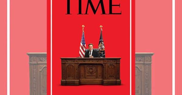En la portada publicada hoy por Time, Musk, vestido de chaqueta negra, camisa blanca y un vaso de café en sus manos mira de frente y a su espalda, están las banderas de EE.UU. y la presidencial, todo sobre un fondo rojo.