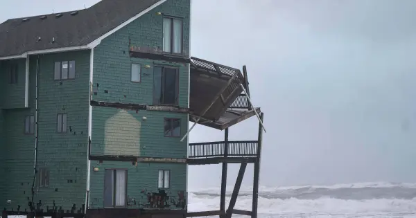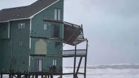 El oleaje fue intenso en la ciudad de Buxton, en la isla de Hatteras, donde varias casas frente a la playa han caído al agua en las últimas semanas. Una vivienda estaba perdiendo sus pilotes el domingo y parecía cerca de colapsar.