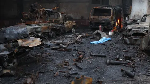 En una calle, los socorristas de la Media Luna Roja Siria hablaron con un residente rodeado de coches carbonizados y edificios residenciales gravemente dañados.