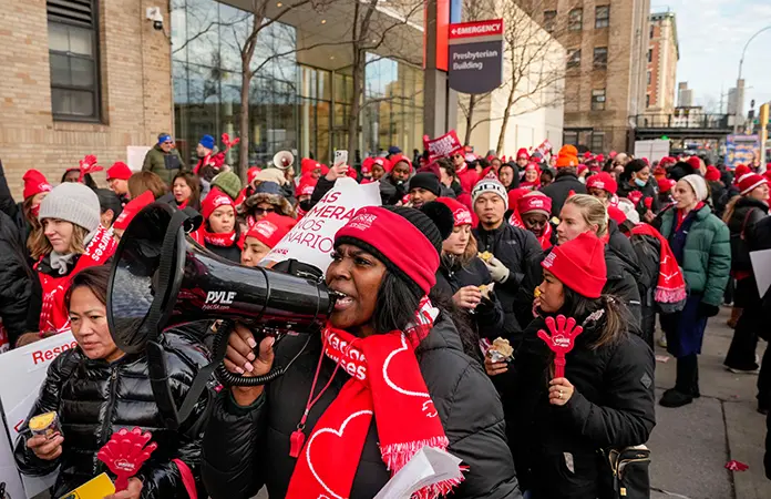 "¡Enfermeros en huelga!... ¡Contrato justo ahora!", gritaban los enfermeros en una línea de piquete fuera del campus del Hospital NewYork-Presbyterian en el Alto Manhattan. Otros más se manifestaron fuera de los hospitales de los sistemas Mount Sinai y Montefiore, donde una huelga de trabajadores de enfermería en 2023 se valió de las frustraciones de la era de la pandemia para llegar a un acuerdo para reforzar los niveles de personal e incrementar los salarios.
