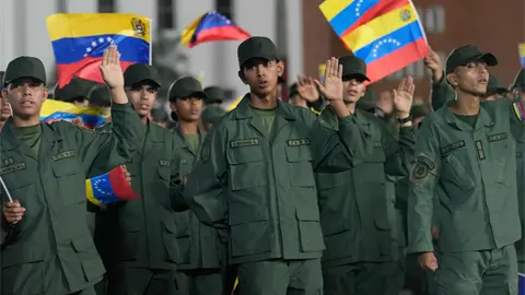 El martes, simpatizantes del partido gobernante marcharon en Caracas para demostrar lo que describieron como el "espíritu antiimperialista" del chavismo. La marcha culminó con una ceremonia en la que Maduro alzó una espada enjoyada que perteneció a Simón Bolívar, héroe sudamericano de guerras de independencia de varios países, y guio a los asistentes, incluidos ministros del Gabinete, a jurar defender la paz y la libertad en nombre de Dios.