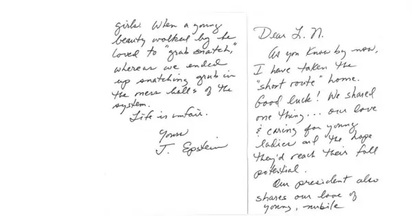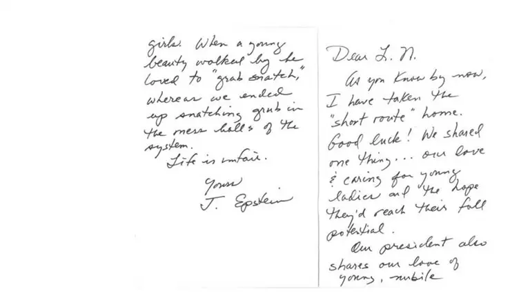 "Estimado L.N. Como ya sabes, he tomado el 'camino corto' a casa. ¡Buena suerte! Compartimos una cosa... nuestro amor y cuidado por las jóvenes y la esperanza de que alcancen su máximo potencial. Nuestro presidente también comparte nuestro amor por las chicas jóvenes y atractivas", detalla el documento escrito a mano.