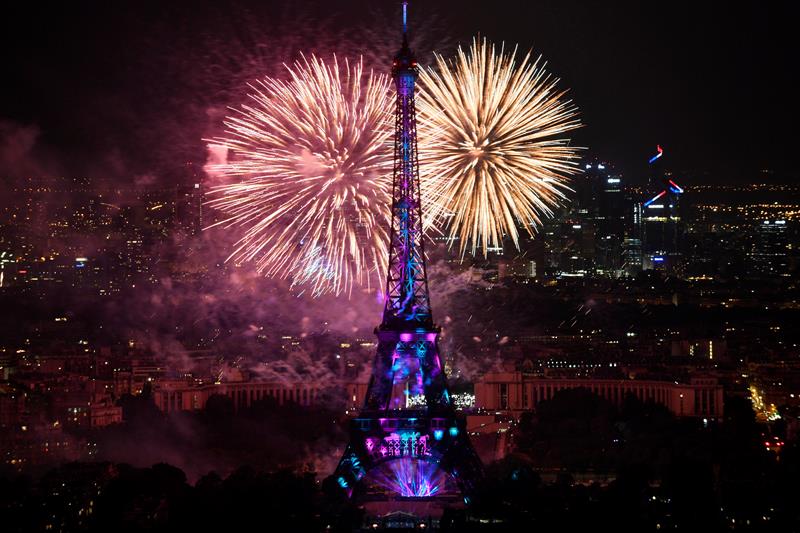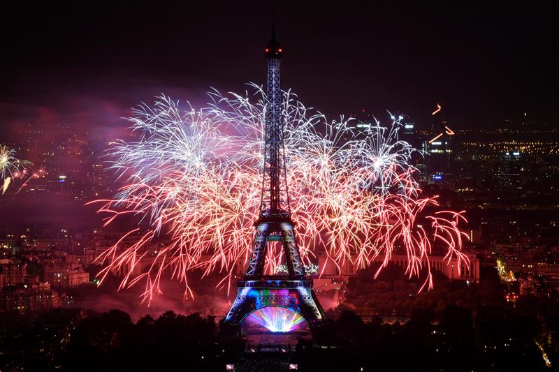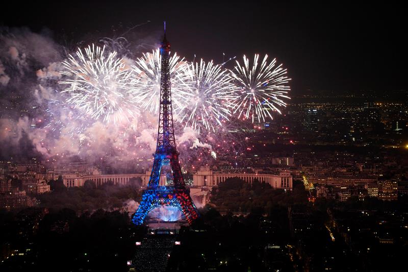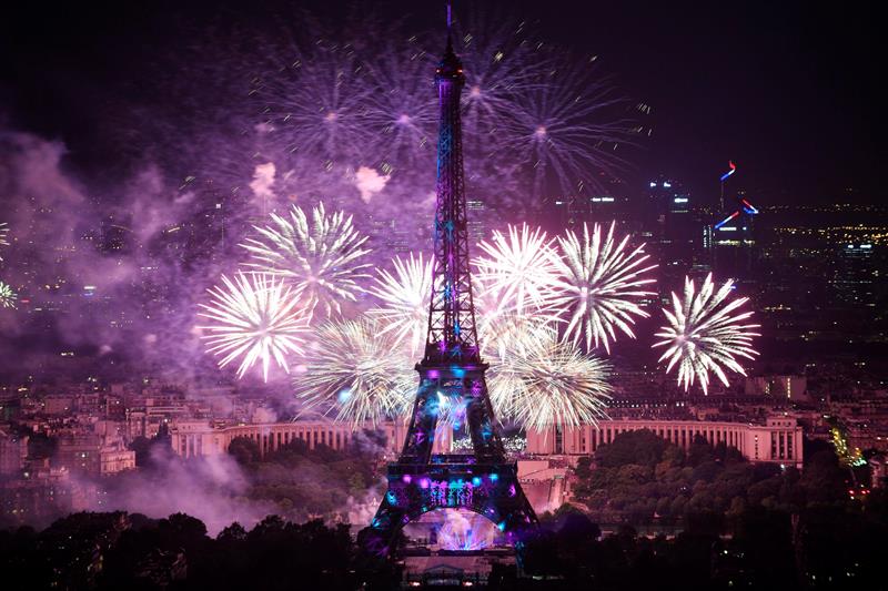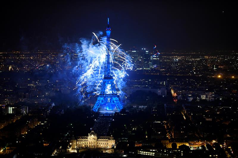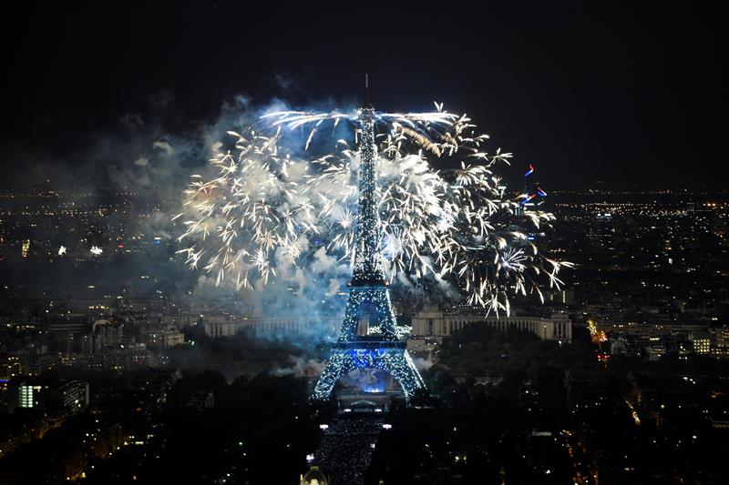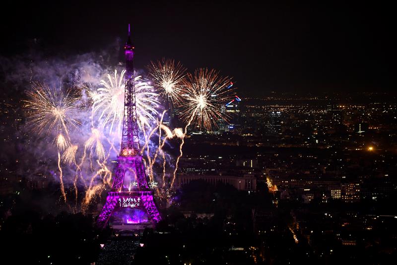 La Torre Eiffel se iluminó esta noche gracias a los fuegos artificiales para conmemorar el Día de la Bastilla.