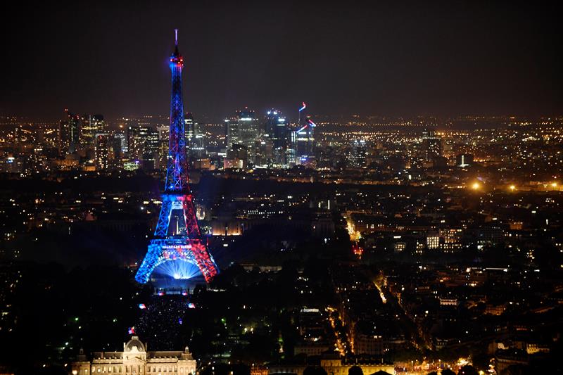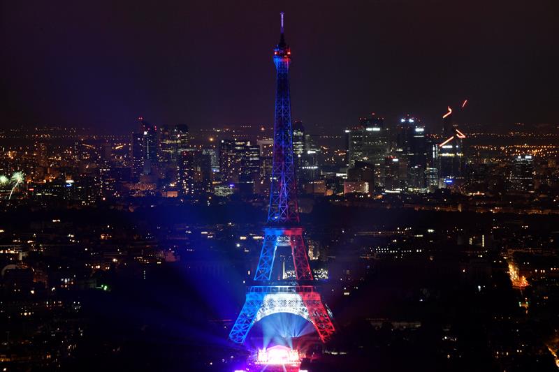 Además de la pirotecnia, la estructura metálica lució iluminada con la bandera francesa.