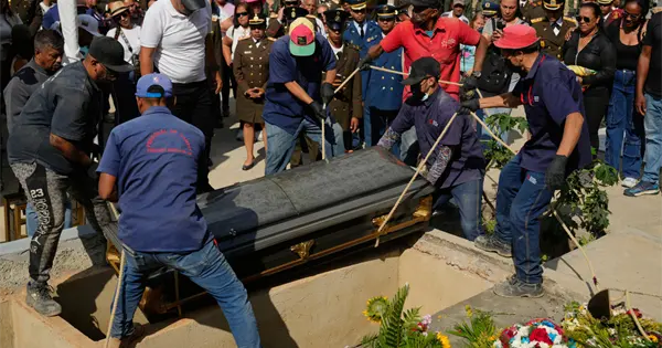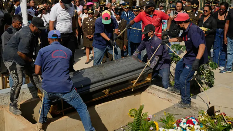 Hombres cargaron ataúdes de madera cubiertos con la bandera venezolana frente a filas de oficiales uniformados. Se escuchaban cantos desde una iglesia cercana en Caracas y la música de una orquesta militar se escuchaba en el cementerio, mientras multitudes de familiares y soldados marchaban detrás de una fila de ataúdes.