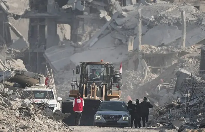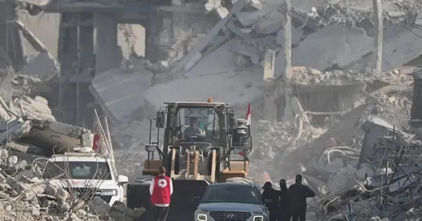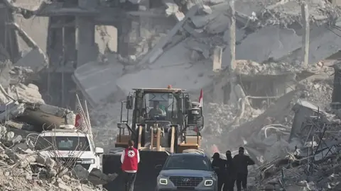 Se vio una excavadora con una bandera egipcia ondeando mientras cavaba en un área severamente destruida en Shijaiya, mientras miembros enmascarados del ala militar de Hamás, las Brigadas Qassam, custodiaban el área. También estaban presentes vehículos del Comité Internacional de la Cruz Roja.