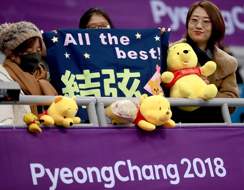 En las gradas en el Pabellón de Hielo de Gangneung se podía ver hoy incluso algunos fans disfrazados del gordinflón oso amarillo con camiseta roja.