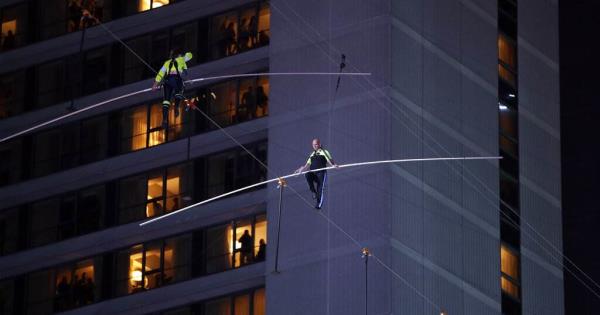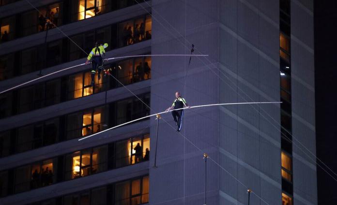La más reciente acrobacia fue transmitida en vivo por ABC y vista por miles de espectadores desde el suelo. Ambos utilizaron arneses de seguridad por requerimiento de la ciudad, en caso de que cayeran.