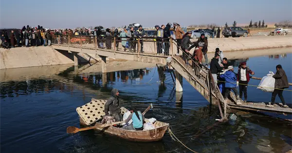 En otras áreas, la gente cruzó canales en pequeños botes y atravesó un puente peatonal seriamente dañado para llegar al lado controlado por las fuerzas del gobierno.