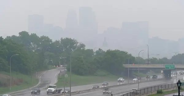 MINNEAPOLIS, Minnesota.- El humo de los incendios forestales en Canadá causó otro día de mala calidad del aire al sur de la frontera hacia el medio oeste de Estados Unidos, donde las condiciones en partes de Minnesota, Wisconsin y Michigan fueron calificadas como “muy insalubres” el martes.